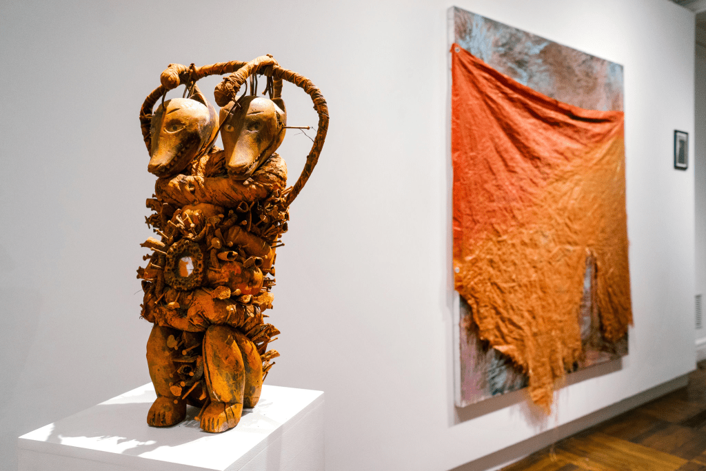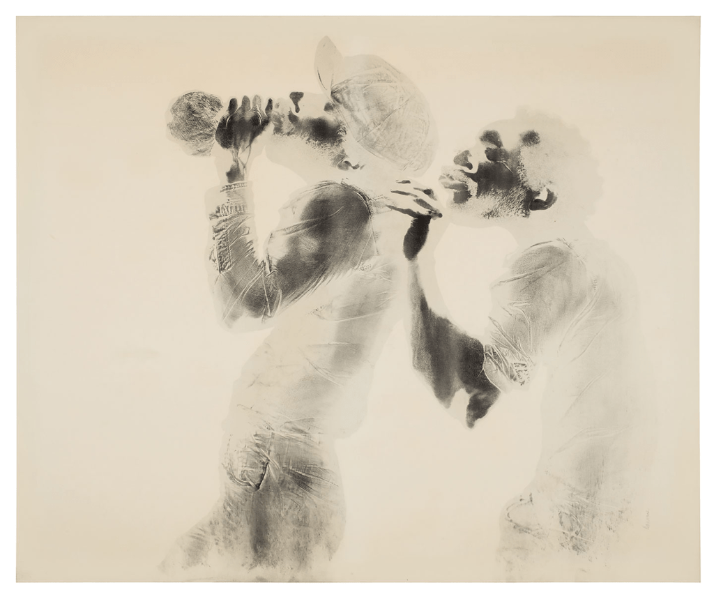 Although he did not choose to work in a traditional realistic style, Hammons translated White’s socially committed, hand-drawn realism into a contemporary realism of found objects and materials. Beginning in the late 1960s, he began to use his own body, greasing it, imprinting it on paper, and sprinkling the result with pigment and graphite to make Body Prints. These X-ray-like figures were punctuated with exacting details of skin, hair, clothes, and body parts created by the process of one-to-one transfer.