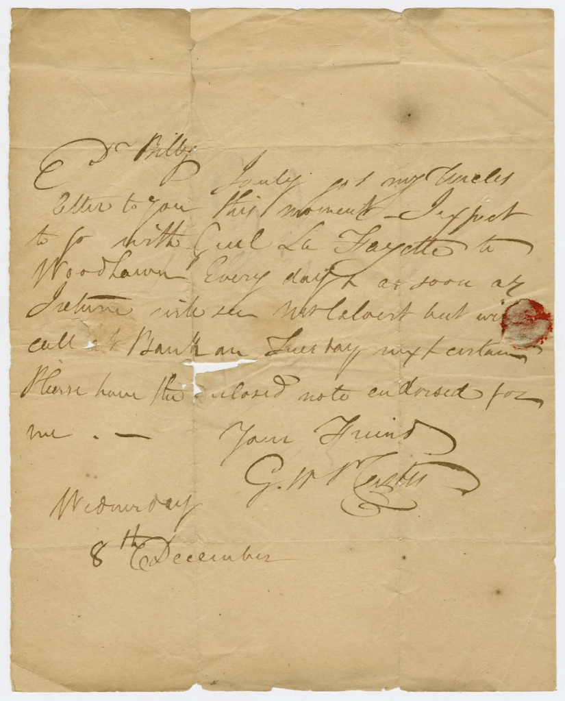 Costin was also in close contact with Jacky’s four white children. Working as a paid carriage driver in D.C., he ran errands for Nelly and Eliza. In 1809, Eliza called him “my faithful ‘tho humble friend Billy”; in 1824, Wash signed a quick note to Costin “Your friend.”