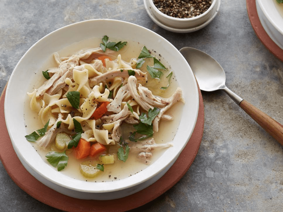 - While the noodles cook, remove and discard the chicken skin and bones and shred the chicken-it will mostly fall apart on its own. When the noodles are done, turn off the cooker, remove the parsley and thyme stems, and add the shredded chicken and 1 tablespoon lemon juice. Taste, and add more lemon juice and salt as needed. Stir in a good amount of pepper and the chopped parsley, and serve hot.