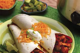 - Carefully remove lid to allow steam to escape. Gently stir chicken and sauce with a plastic or wooden slotted spoon. Spoon 1/2 cup of chicken mixture into center of each tortilla; add desired toppings and fold tortilla over filling. Do not lift or transport liner with food inside. Cool slow cooker completely; remove Reynolds® Slow Cooker Liner and toss.