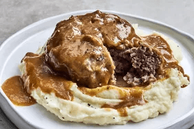 DOTDASH MEREDITH FOOD STUDIOS - Mix condensed soup, water, and au jus mix together in a medium bowl; pour over the beef patties.