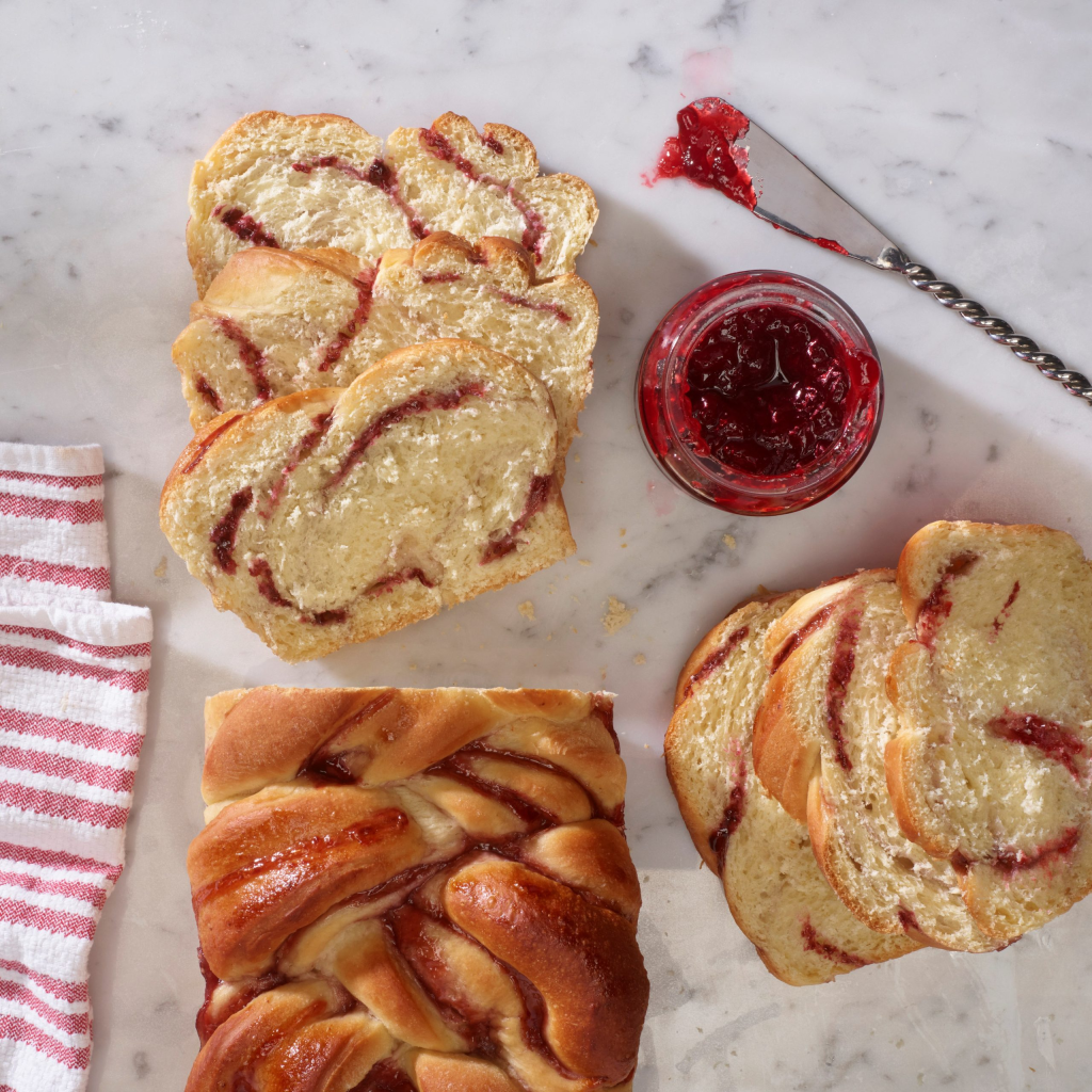 Leaving 1 inch uncut at the top, cut the roll longways into 3 thinner strips. Carefully roll the strips so that the cut jam side is facing up, then braid the strips together. Tuck the ends under and place in prepared pan. Cover loosely with plastic wrap. Let rise in warm place (80 to 90°F) for 45 minutes or until doubled in size.