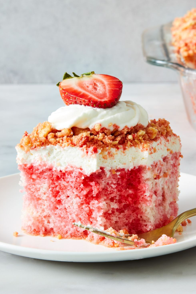 Step 5 Pour gelatin mixture evenly over holes on cake. Cover and refrigerate at least 2 hours or up to overnight.