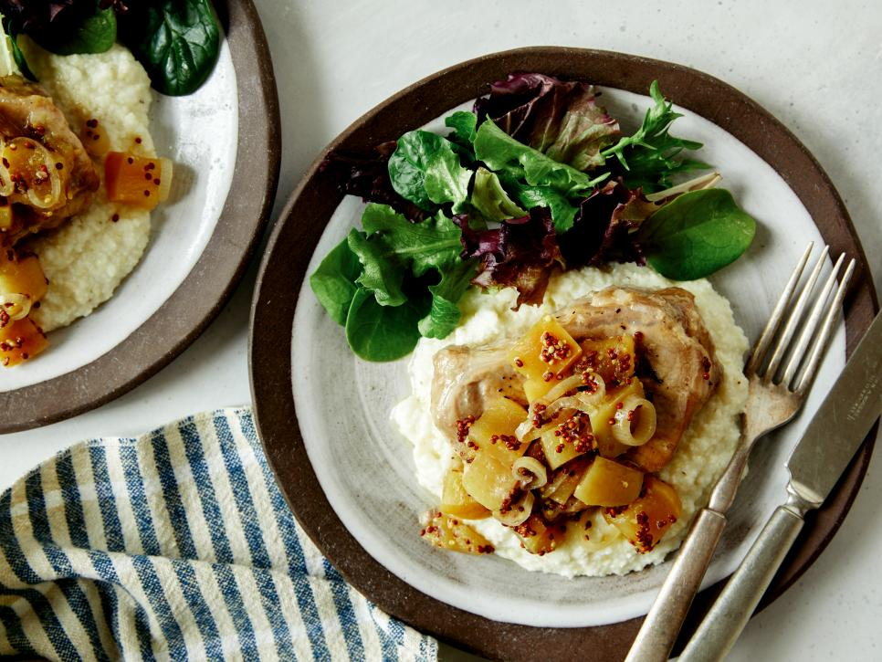 - Add the mustard, honey and 1 tablespoon of water to a 4- to 6-quart slow cooker and stir to combine. Cut the shallot into rings and add to the cooker, separating the rings. Core and cut the apple into 1/2-inch chunks and add to the cooker with 1/4 teaspoon salt. Stir to combine the shallots and apples with the sauce. Spread the mixture in an even layer and lay the pork chops on top, overlapping as needed.
