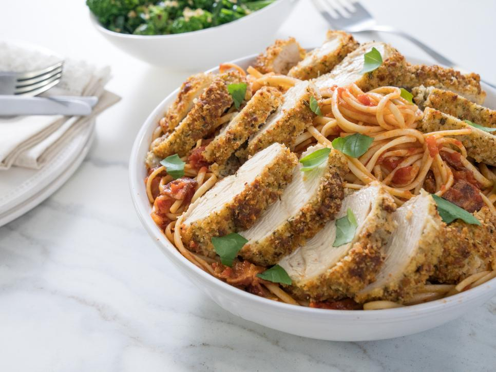 - Line a sheet pan with parchment paper and set aside. Add the flour to a shallow bowl and season with salt and pepper. Add the eggs to a second shallow bowl and season with salt and pepper. Add the panko, Parmesan, Italian seasoning, the pinch red pepper flakes and some salt and pepper to a third shallow bowl and mix well. Coat the chicken in the flour and shake off the excess. Dip in the egg mixture, and finally, coat well in the panko mixture. Place on the lined sheet pan and spray with cooking spray. Bake until cooked through and golden brown, 30 to 35 minutes.