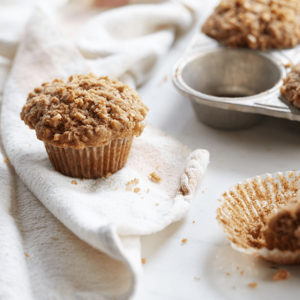HEAT oven to 375°F. Coat 6 muffin cups with no-stick cooking spray, including top of pan. Combine 2 tablespoons flour, 3 tablespoons brown sugar and butter in small bowl. Blend with fork until crumbly. Stir in walnuts.