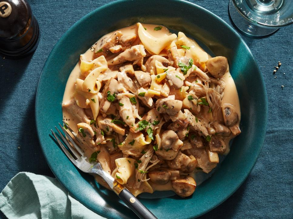 - Transfer the chicken to a small bowl and shred with 2 forks. Whisk the cream cheese into the sauce until completely incorporated; stir in the chicken and noodles. Top with parsley before serving.