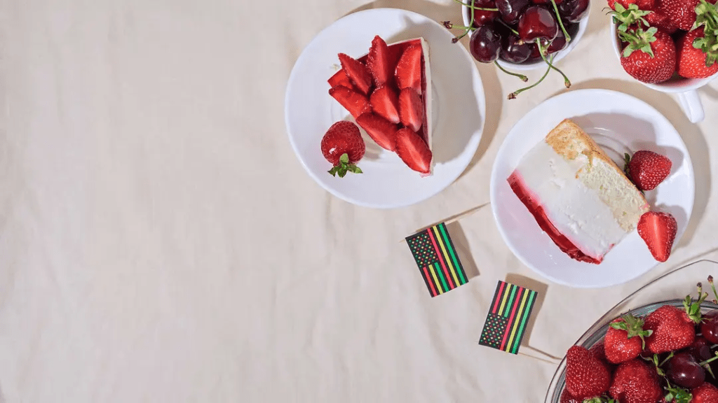 JUNETEENTH DAY PICNIC BACKGROUND WITH BLACK LIBERATION AFRICAN AMERICAN FLAGS, SWEET SALAD WITH CHERRIES AND STRAWBERRIES, STRAWBERRY CHEESECAKE.