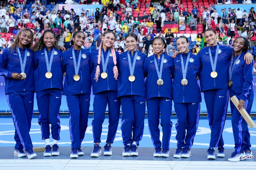 Jaedyn Shaw , Casey Krueger , Naomi Girma , Trinity Rodman , Sophia Smith , Mallory Swanson , Lynn Williams , Crystal Dunn pose with their gold medal after winning the Women’s Gold Medal match between Brazil and United States of America during the Olympic Games Paris 2024 at Parc des Princes on August 10, 2024 in Paris, France. Photo: Daniela Porcelli/ISI Photos/Getty Images