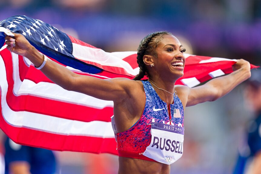 Masai Russell’s Olympic debut couldn’t have been scripted better. The 24-year-old Maryland native won gold in the women’s 100m hurdles, taking home her first career Olympic medal. It was a nailbiter, however, as Russell edged out France’s Cyrena Samba-Mayela (silver) by just a hundredth of a second. Puerto Rico’s Jasmine Camacho-Quinn took bronze.