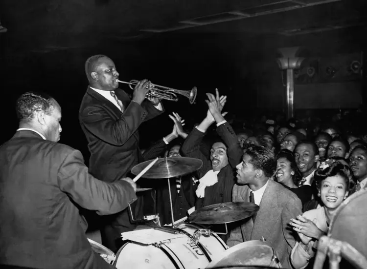 Cootie Williams plays his trumpet at a crowded at Harlem ballroom with Duke Ellington’s band in the 1930’s.