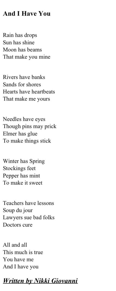 Black Poetry: Nikki Giovanni Posted bydeidredeanneFebruary 12, 2025January 14, 2025Posted inarticles Share this: Click to share on X (Opens in new window) X Click to share on Facebook (Opens in new window) Facebook Like Loading... Related