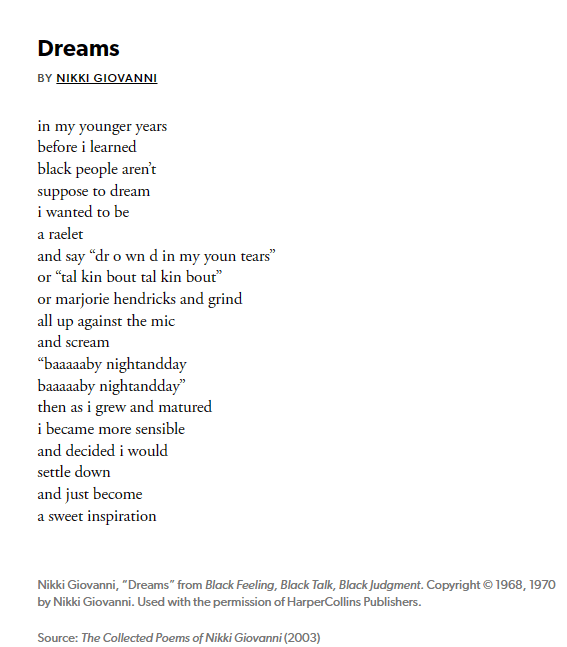 Black Poetry: Nikki Giovanni Posted bydeidredeanneFebruary 17, 2025January 14, 2025Posted inarticles Share this: Click to share on X (Opens in new window) X Click to share on Facebook (Opens in new window) Facebook Like Loading... Related