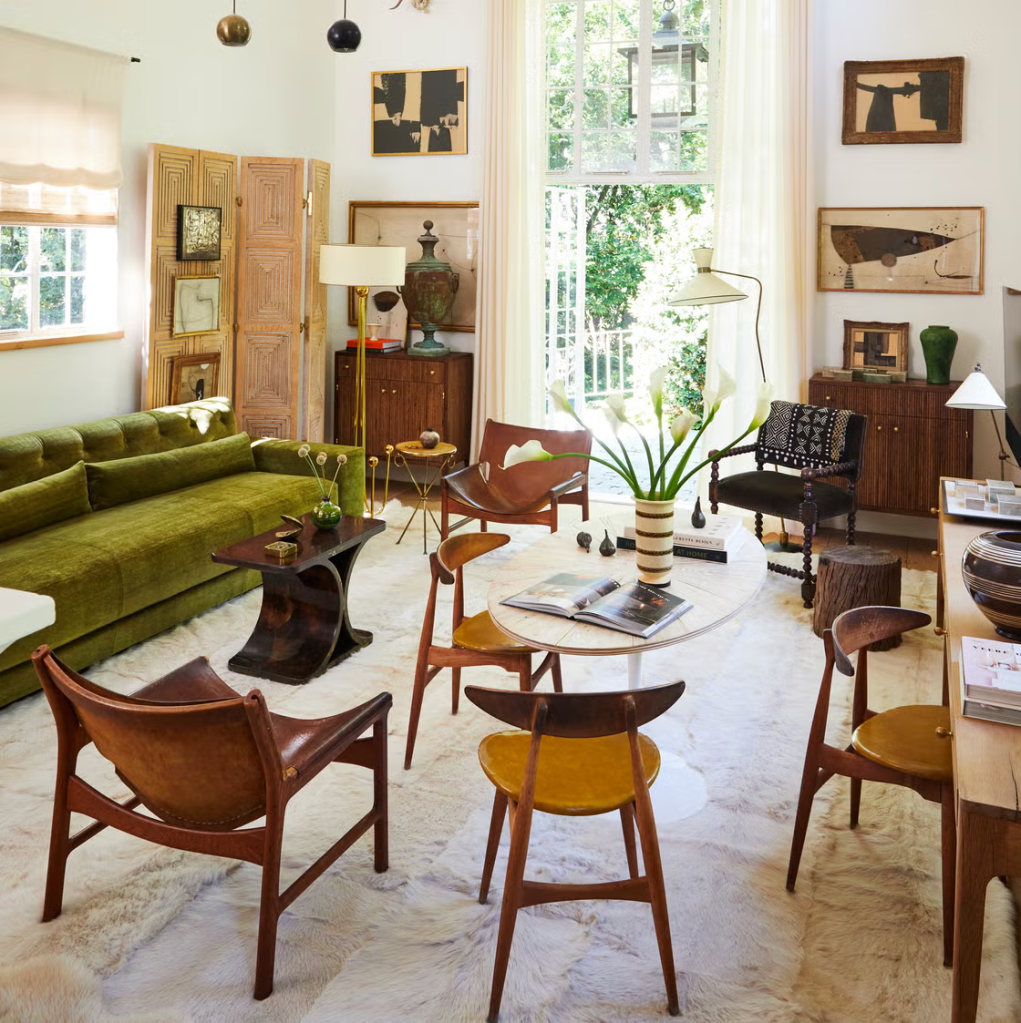 Fahden shares that mid-century modern furniture has become a favorite style of younger collectors, proving that what goes around comes back around—especially in design. Seating options like this chic settee from Cesare Lacca, as well as designs from Dunbar, are highly sought after.