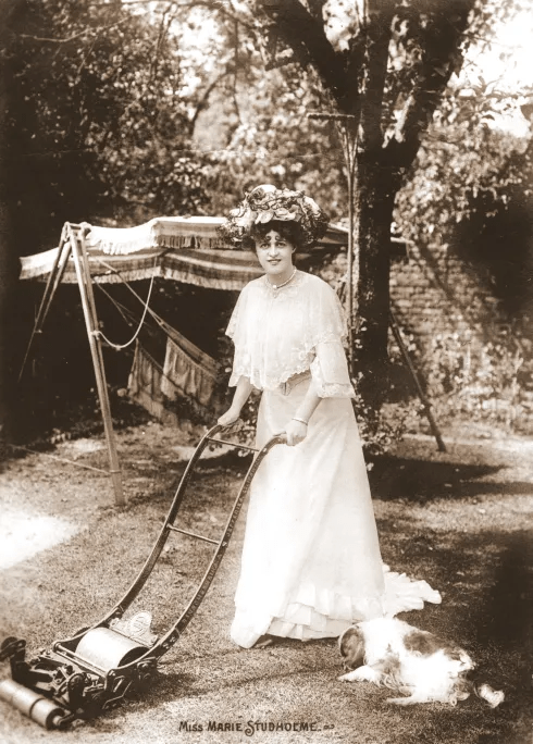 My occasional wanderings through the world of Victorian ephemera have definitely convinced me that bicycles represented a form of liberation–physical and otherwise–for women a century or so ago, but I’m confused by the multitudes of similar contemporaneous images of women operating lawnmowers: why would women actually choose to do tedious men’s work–didn’t they have enough to do, or, weren’t they in a good position to get out of it? Is this a case of advertising push rather than feminine pull? Women in short shorts and other inappropriate attire seem to be featured regularly in post-war advertisements for lawnmowers, but I’m more curious about trade cards and such appearing fifty years earlier, when women were supposed to be a bit more closeted. The first “lady with lawnmower” that captured my attention featured was an apparently quite famous English actress named Marie Studholme (1872-1930), who posed with all sorts of things, so I thought the lawnmower was just one more thing. But she was in good company: between 1890 and 1910 or so there were several manufacturers that seem to be marketing lawn mowers for women, or lawnmowers that were so easy to use that even girls could operate them (in their perfect pinafores). Perhaps this is a case of class trumping gender: after all, the majority of women didn’t have expansive lawns in need of tending. The lawn itself, like the lawn mower, is a nineteenth-century creation. I must confess to having a rather romantic attachment to my own manual lawnmower, but only because my backyard is mostly garden with very little lawn–and my husband always does the mowing.
